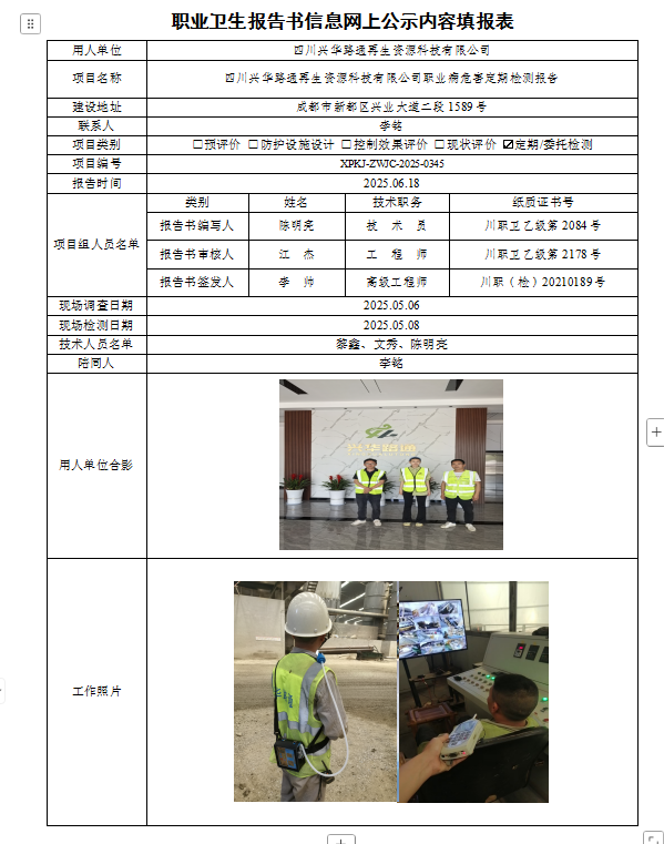 四川兴华路通再生资源科技有限公司职业病危害因素定期检测