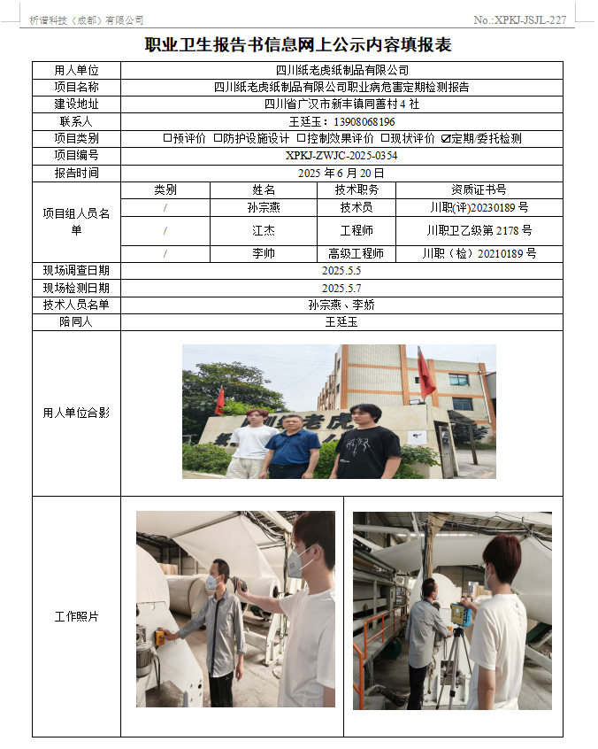 四川纸老虎纸制品有限公司职业病危害因素定期检测