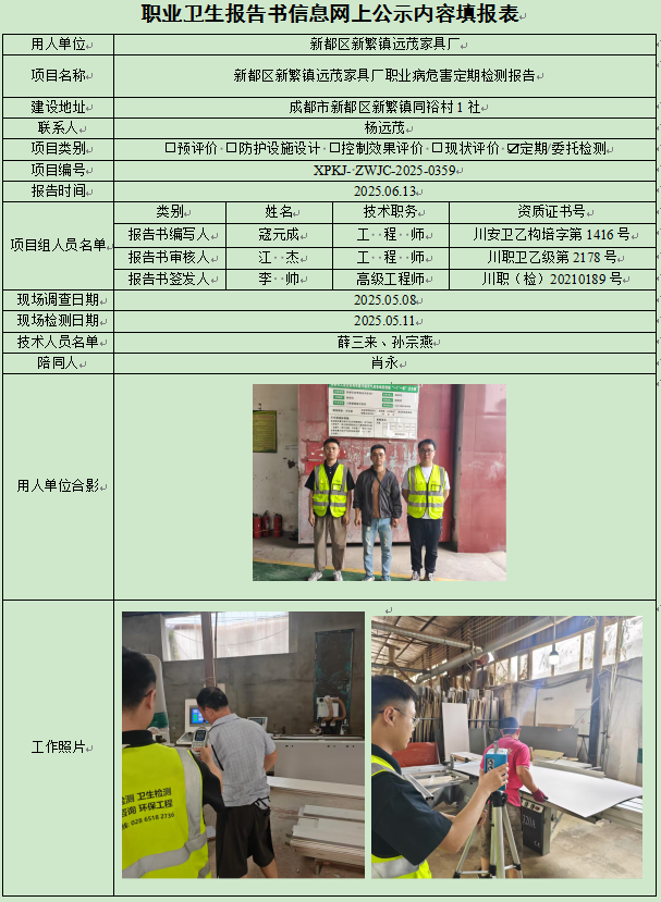 新都区新繁镇远茂家具厂职业病危害因素定期检测