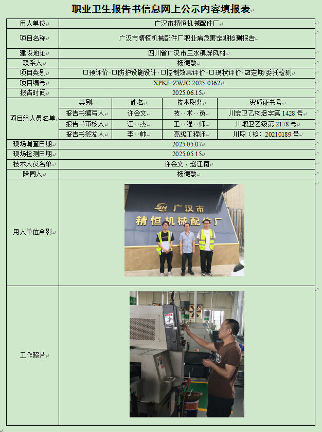 广汉市精恒机械配件厂职业病危害因素定期检测