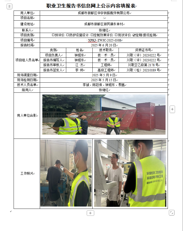 成都市新都区华宇铁路配件有限公司职业病危害因素定期检测