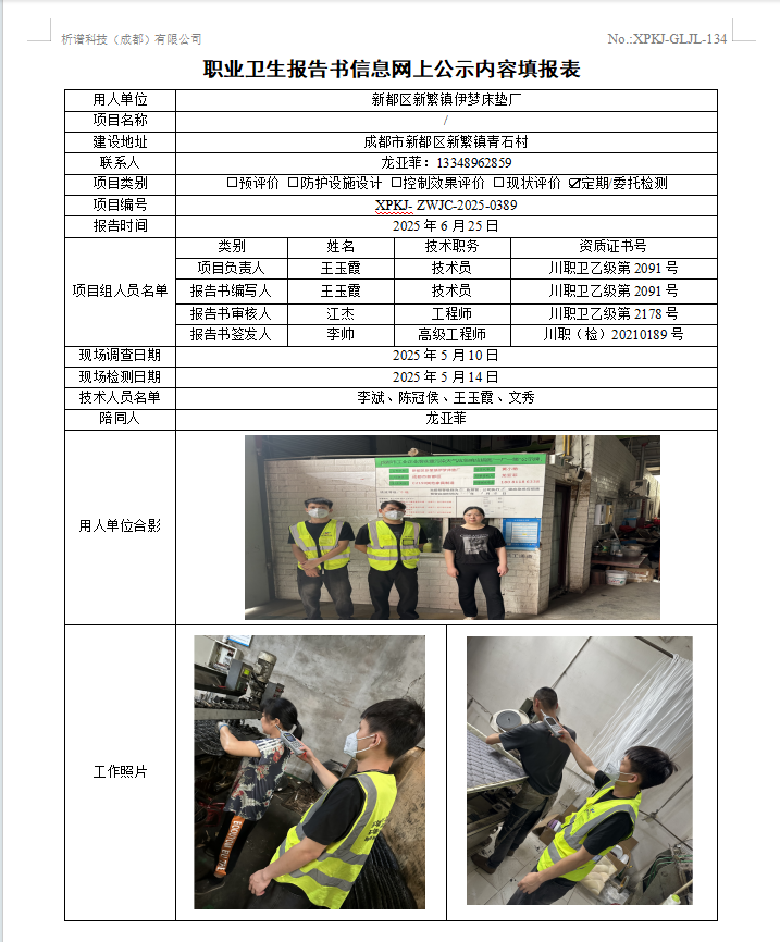 新都区新繁镇伊梦床垫厂职业病危害因素定期检测