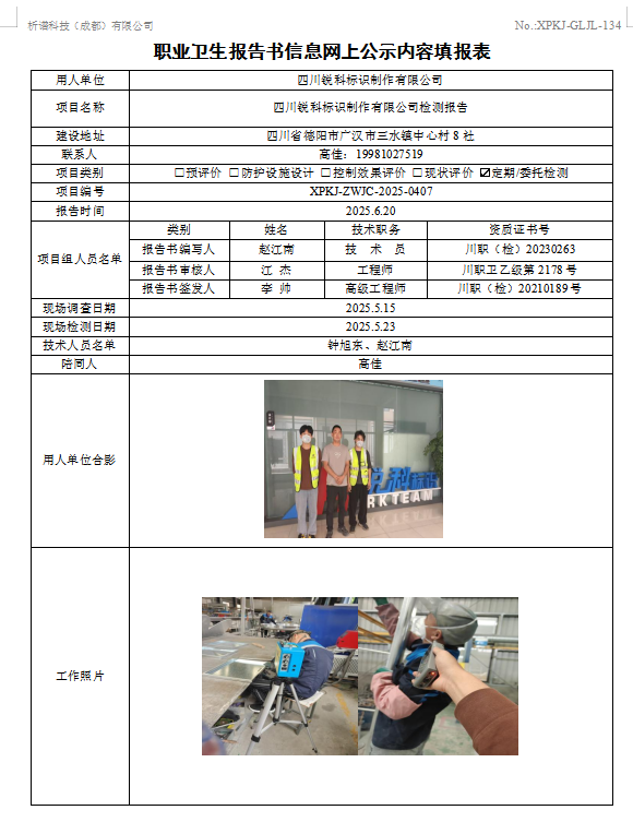 四川锐科标识制作有限公司职业病危害因素定期检测