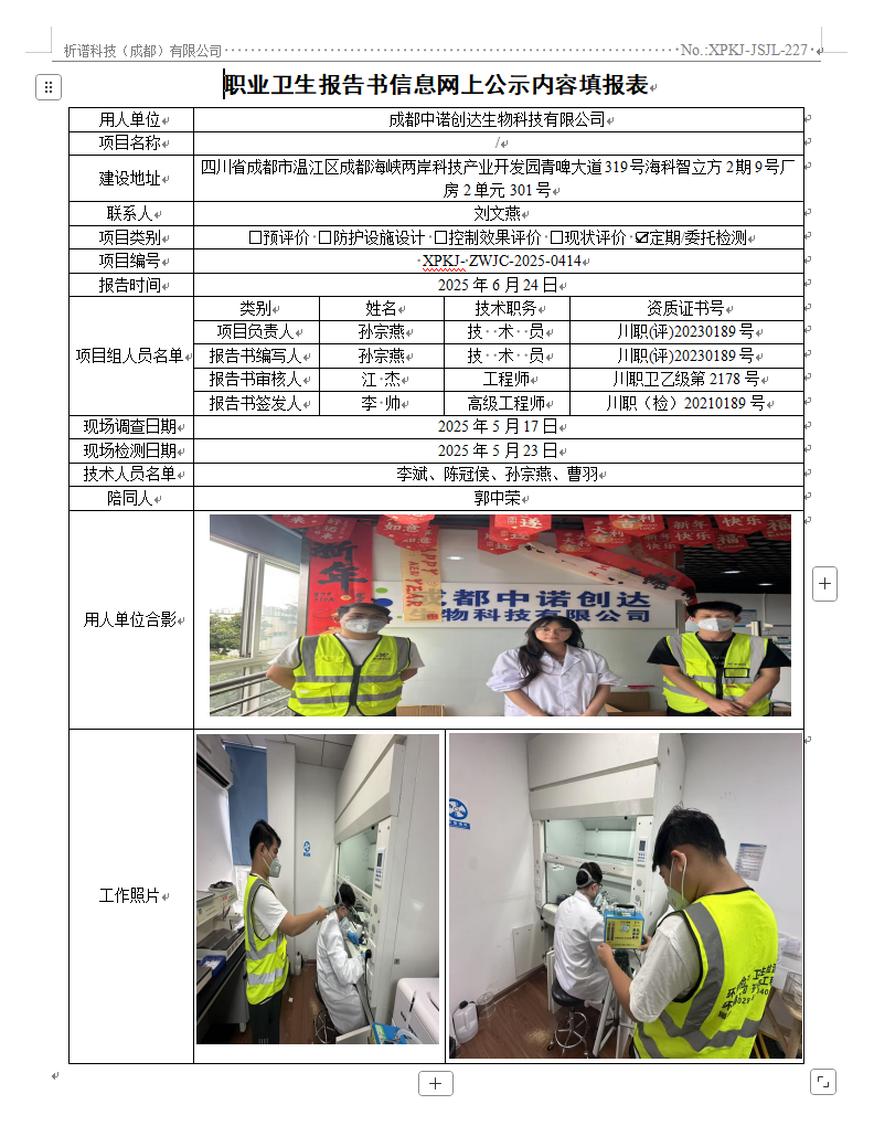 成都中诺创达生物科技有限公司职业病危害因素定期检测