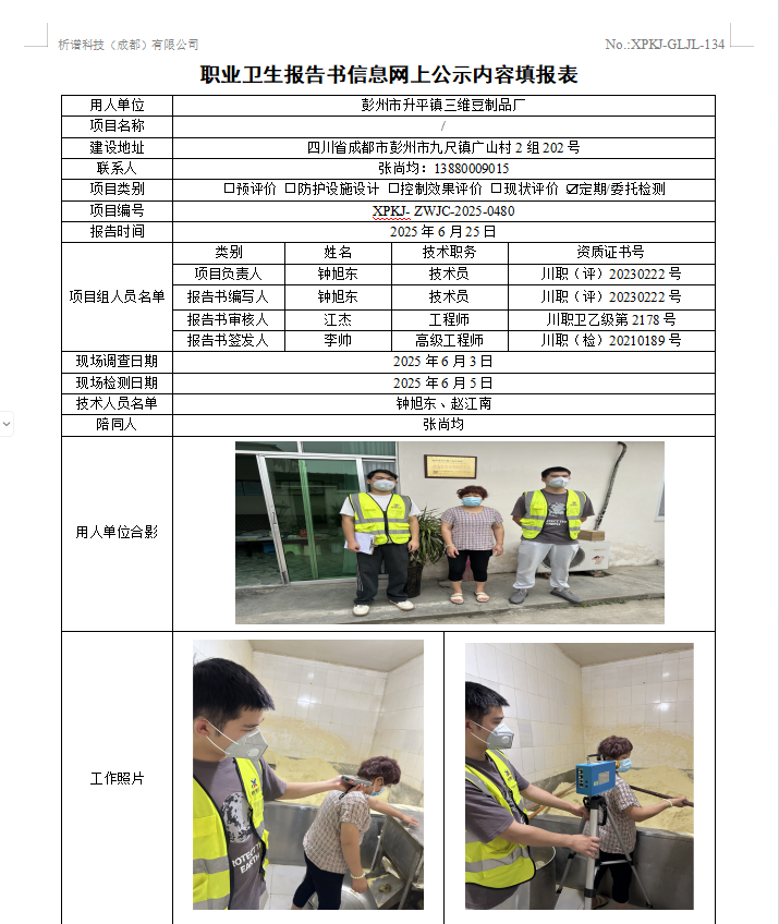 彭州市升平镇三维豆制品厂职业病危害因素定期检测