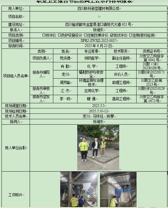 四川铁科新型建材有限公司职业病危害因素现状评价