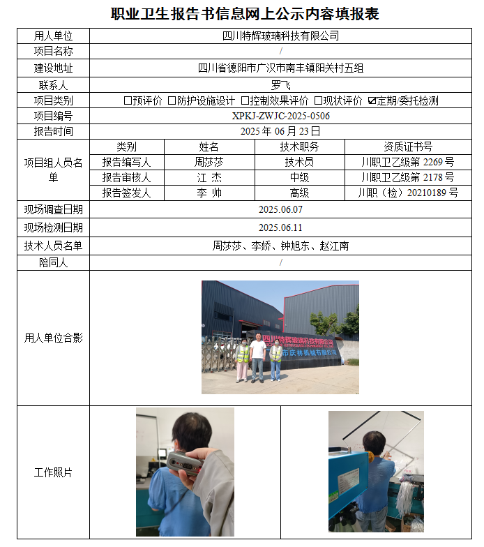 四川特辉玻璃科技有限公司职业病危害因素定期检测