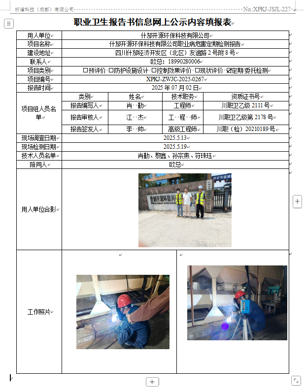 什邡开源环保科技有限公司职业病危害因素定期检测