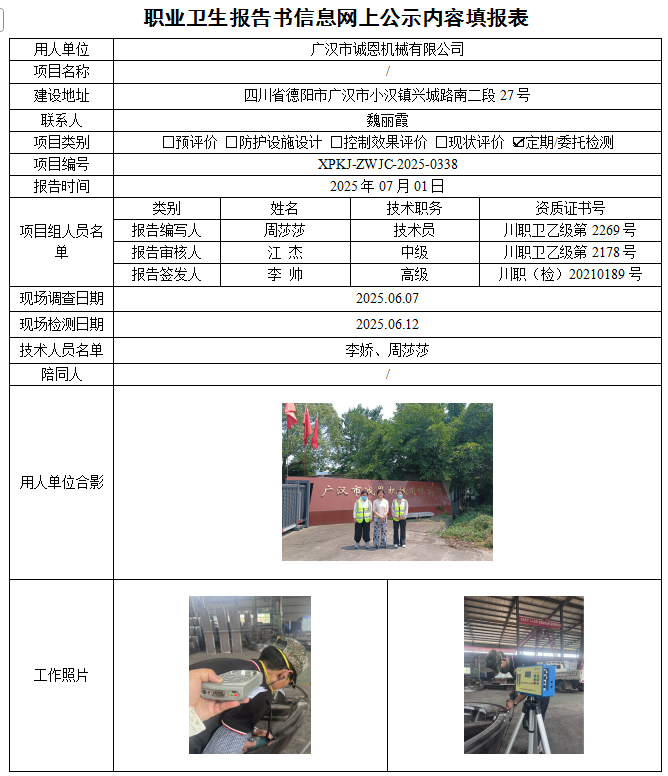 广汉市诚恩机械有限公司职业病危害因素定期检测
