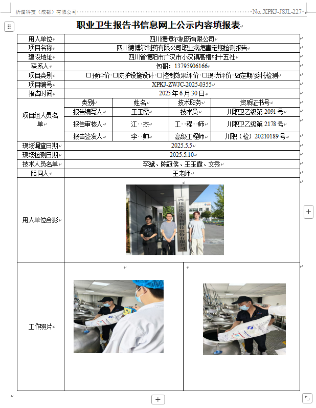 四川德博尔制药有限公司职业病危害因素定期检测