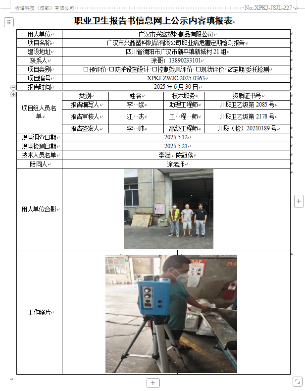 广汉市兴鑫塑料制品有限公司职业病危害因素定期检测