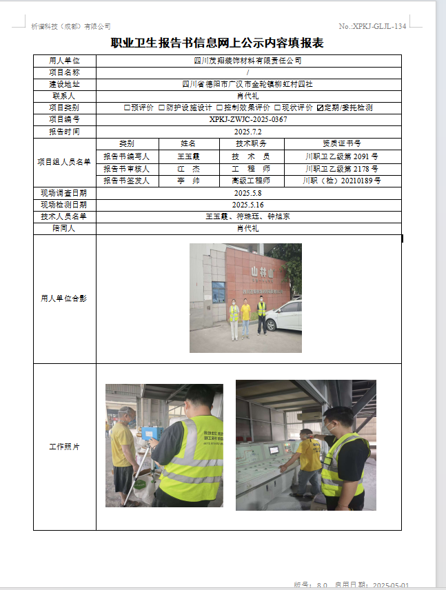 四川茂翔装饰材料有限责任公司职业病危害因素定期检测