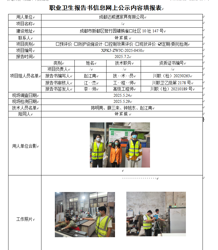 成都百得胜智能家居有限公司职业病危害因素定期检测