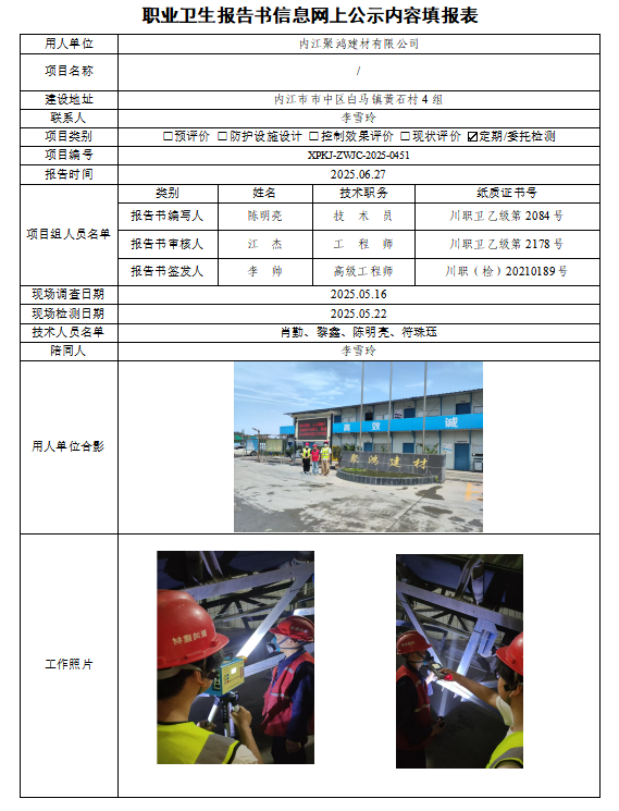 内江聚鸿建材有限公司职业病危害因素定期检测