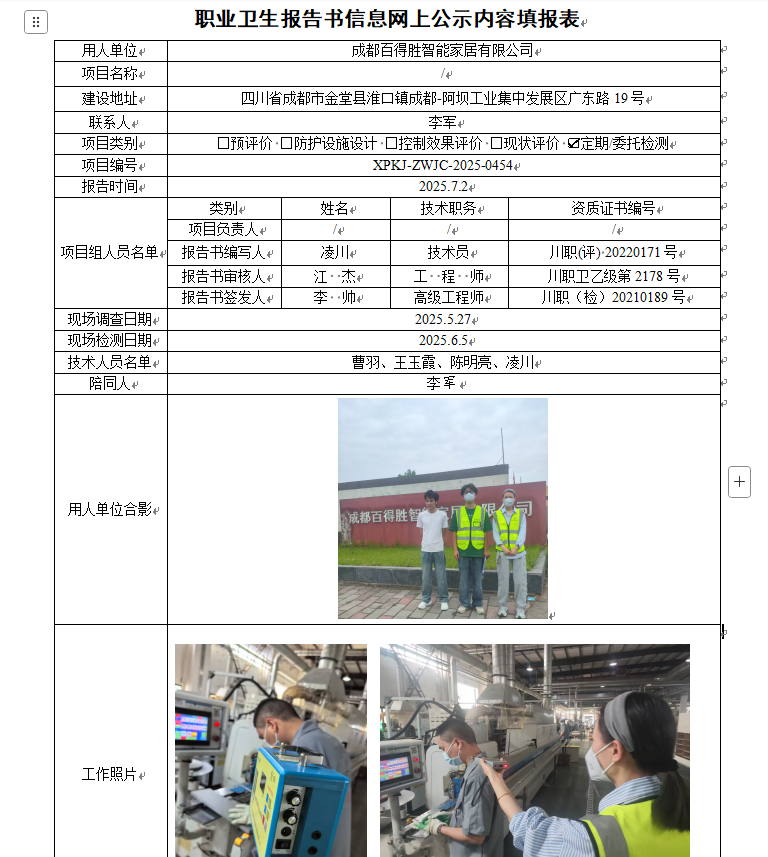 成都百得胜智能家居有限公司职业病危害因素定期检测