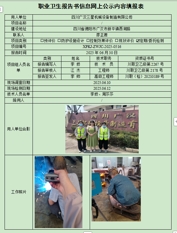 四川广汉三星机械设备制造有限公司职业病危害因素定期检测