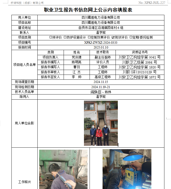 四川蜀胜电力设备有限公司职业病危害因素现状评价