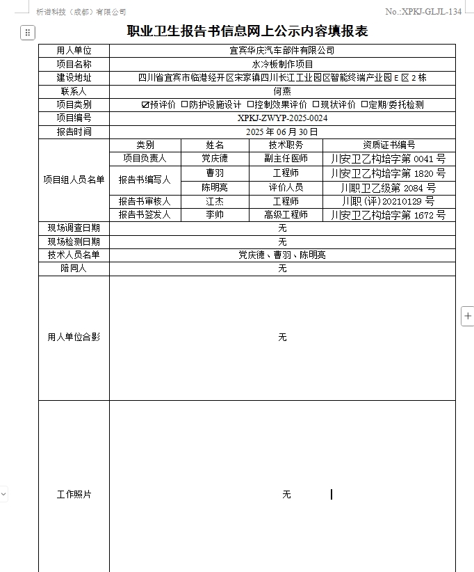 宜宾华庆汽车部件有限公司职业病危害因素预评价