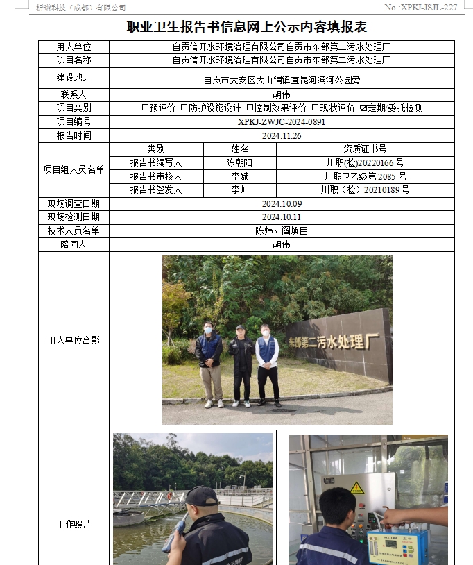 自贡信开水环境治理有限公司自贡市污水处理厂职业病危害因素定期检测