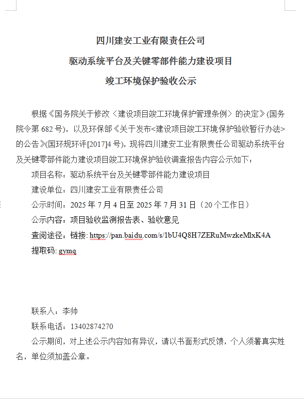 四川建安工业有限责任公司驱动系统平台及关键零部件能力建设项目 竣工环境保护验收公示