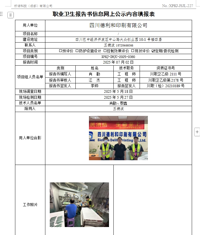 四川德利和印刷有限公司职业病危害因素定期检测