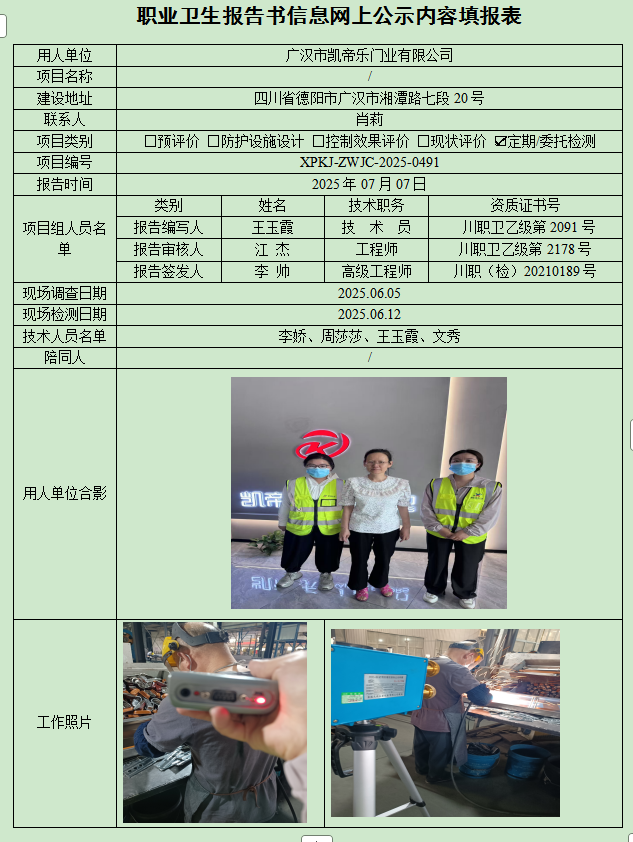 广汉市凯帝乐门业有限公司职业病危害因素定期检测