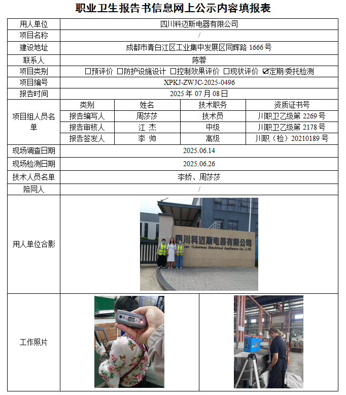 四川科迈斯电器有限公司职业病危害因素定期检测