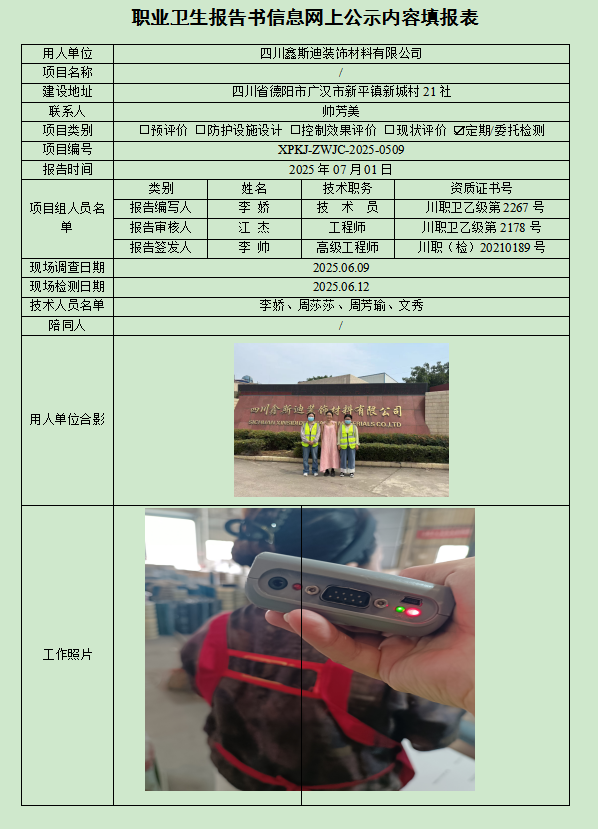 四川鑫斯迪装饰材料有限公司职业病危害因素定期检测