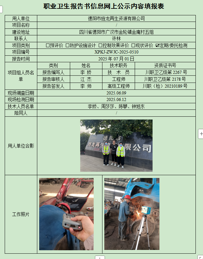 德阳市旌龙再生资源有限公司职业病危害因素定期检测