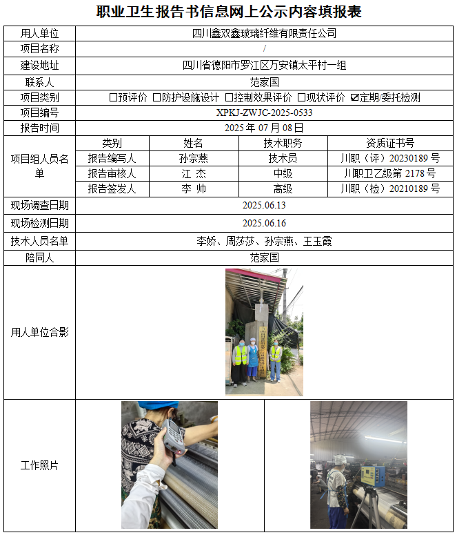 四川鑫双鑫玻璃纤维有限责任公司职业病危害因素定期检测