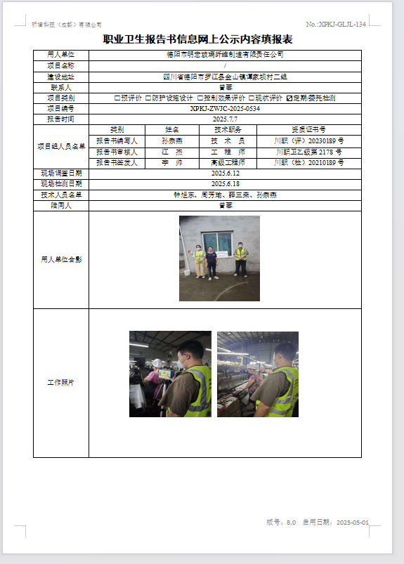 德阳市明宏玻璃纤维制造有限责任公司职业病危害因素定期检测