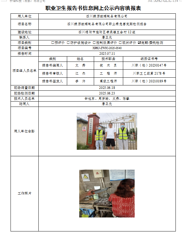四川振源玻璃制品有限公司职业病危害因素定期检测