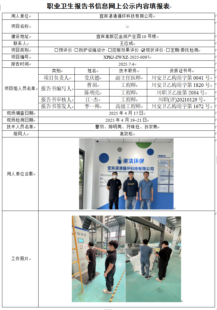 宜宾湛清循环科技有限公司职业病危害因素现状评价