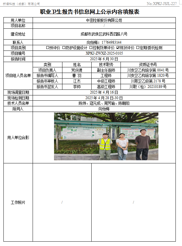四川鑫铖环保科技有限责任公司职业病危害因素定期检测