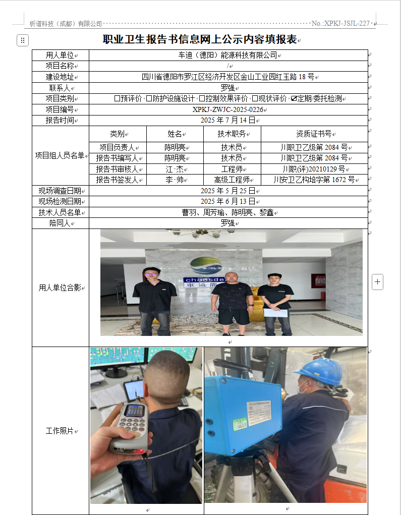 车迪(德阳)能源科技有限公司职业病危害因素定期检测