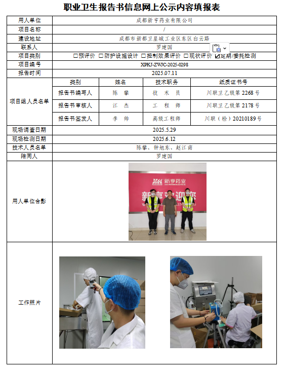 成都新亨药业有限公司职业病危害因素定期检测