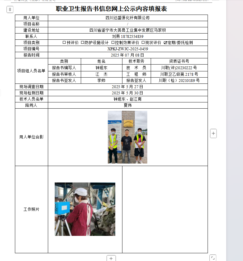 四川达盛源化纤有限公司职业病危害因素定期检测