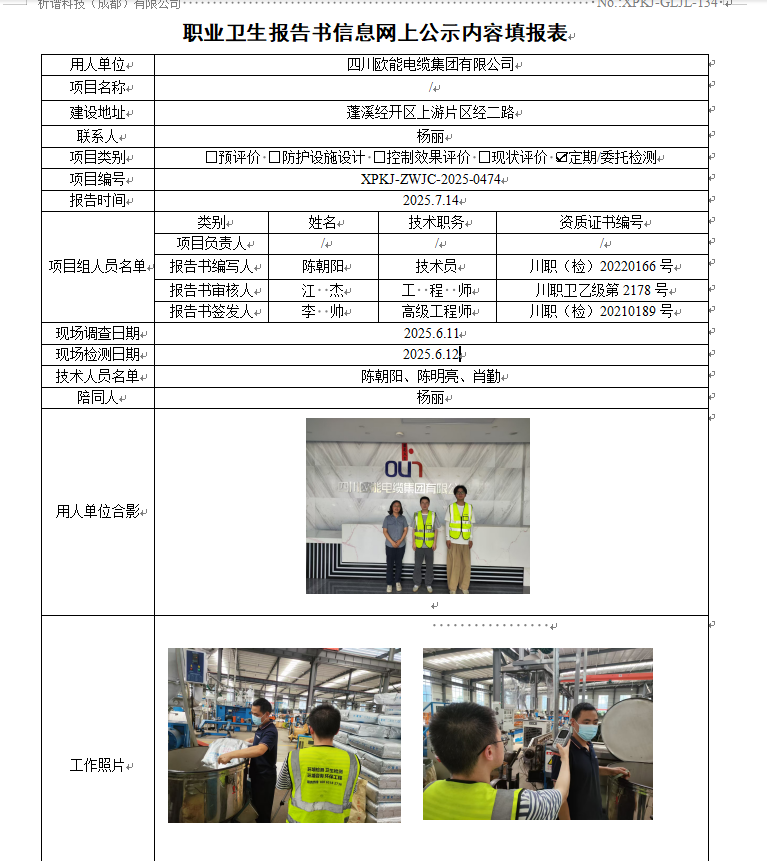 四川欧能电缆集团有限公司职业病危害因素定期检测
