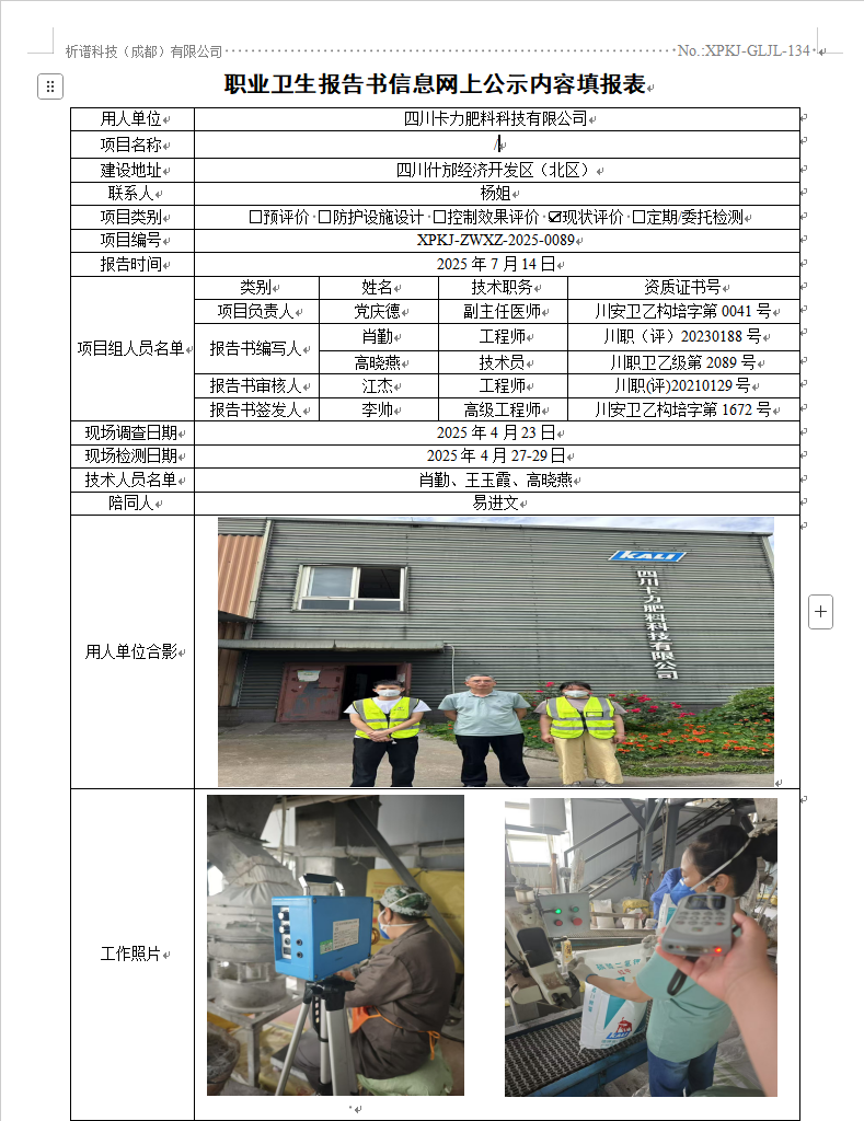 四川卡力肥料科技有限公司职业病危害因素现状评价