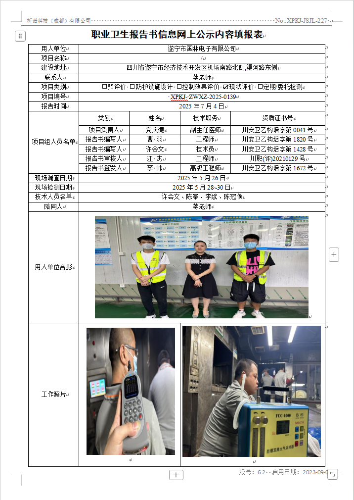 遂宁市国林电子有限公司职业病危害因素现状评价