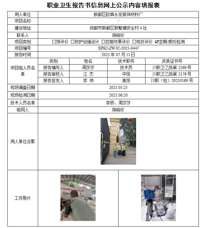 新都区欧典永宏装饰材料厂职业病危害因素定期检测