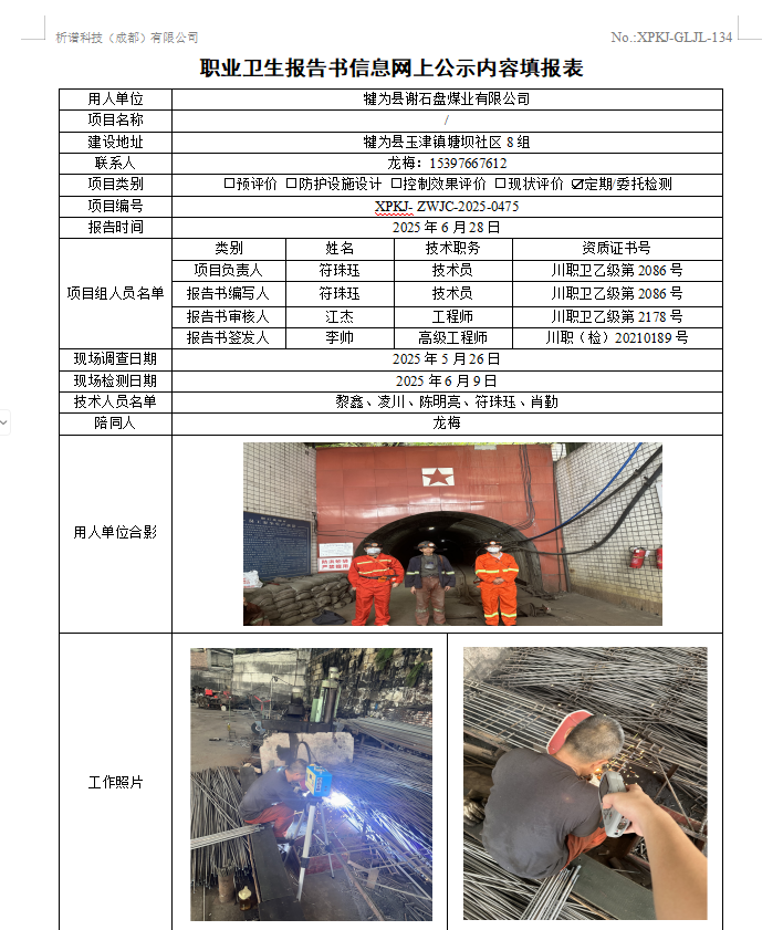 犍为县谢石盘煤业有限公司职业病危害因素定期检测