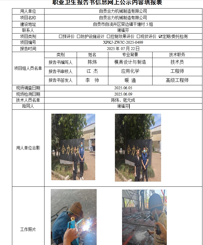 自贡合力机械制造有限公司职业病危害因素定期检测