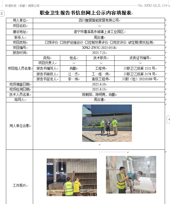 四川皇居智能家居有限公司职业病危害因素定期检测
