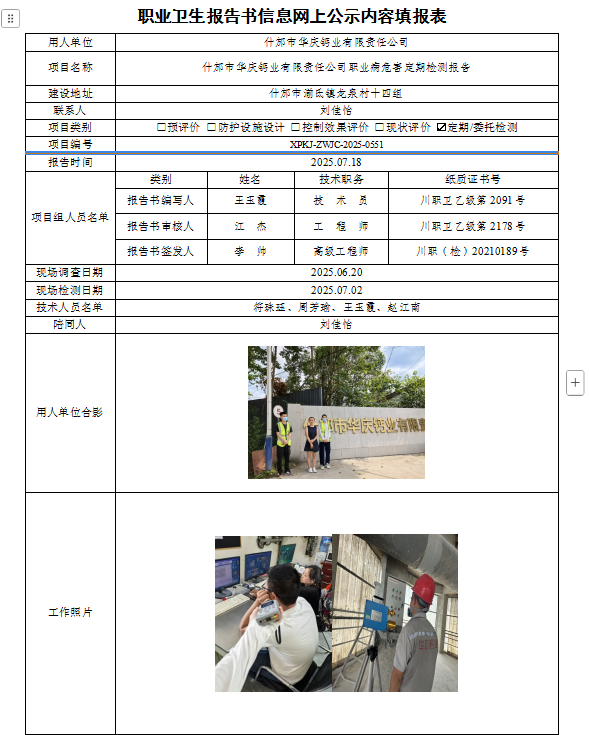 什邡市华庆钙业有限责任公司职业病危害因素定期检测