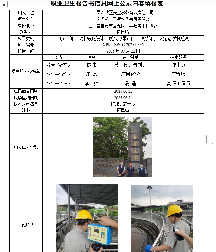 自贡沿滩区天盛水务有限责任公司职业病危害因素定期检测