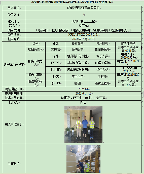 成都思惠化工有限责任公司职业病危害因素现状评价
