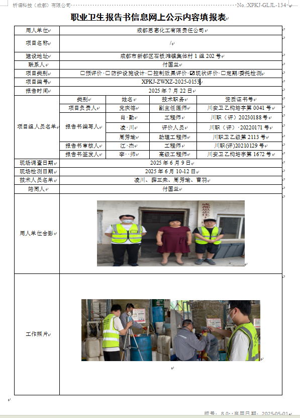 成都思惠化工有限责任公司职业病危害因素现状评价