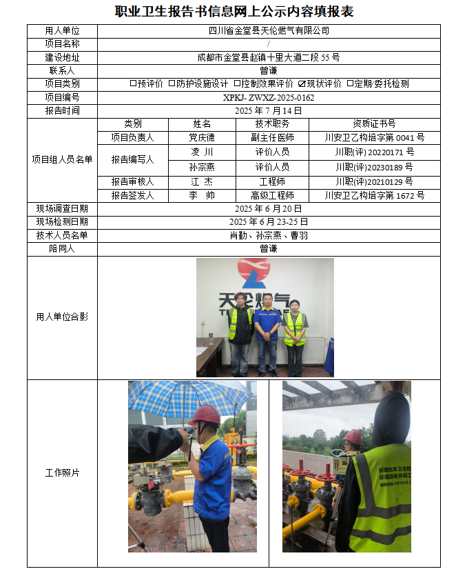 四川省金堂县天伦燃气有限公司职业病危害因素现状评价