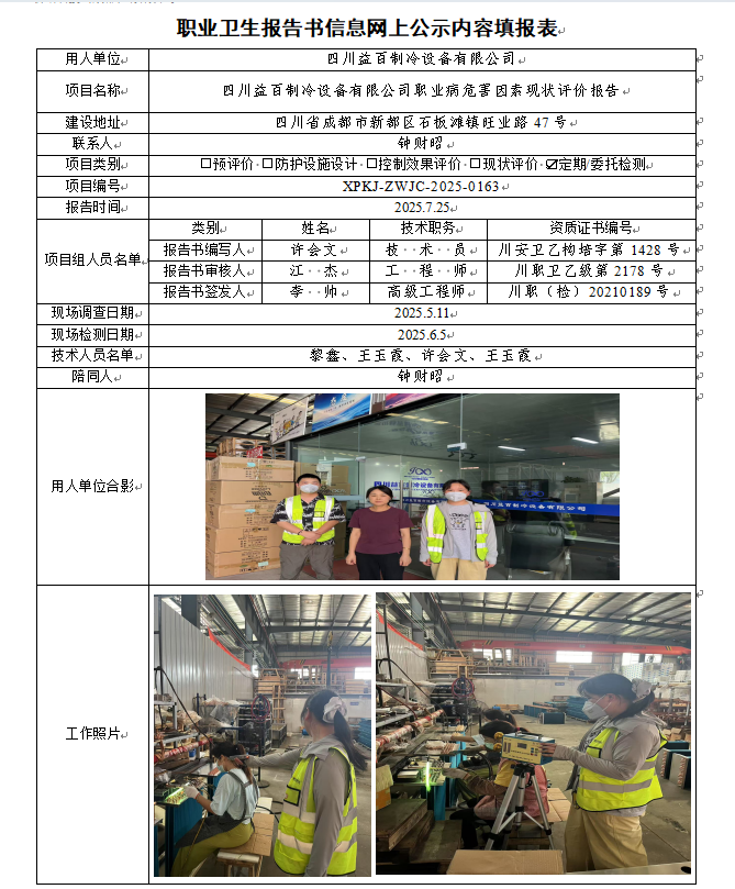 四川益百制冷设备有限公司职业病危害因素定期检测